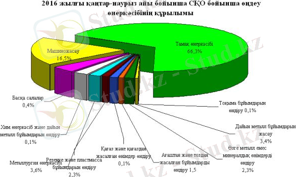 2016 жылғы қаңтар-наурызға 15 319, 2 млн. теңгенi тамақ өнiмдерi өндiрiсi құрады, заттай түрде құс етiнiң өндiрiсi 11, 5%, шұжық өнiмдерi - 5, 1%, ұн - 25, 8%, сары май - 13, 3%, ыстық нан - 8, 3% ұлғайды.