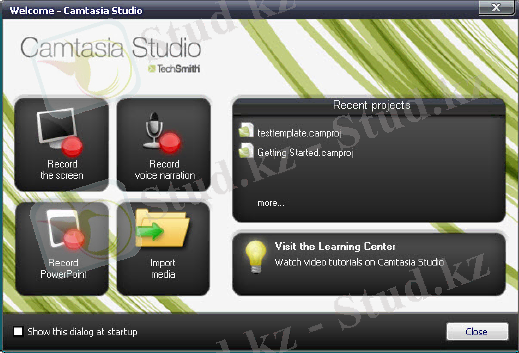 Camtasia Studio 7 бағдарламасының бастапқы терезесі ашылған кезде берілген режимдердің біреуін таңдауға болады: экрандағы іс-әрекетті жазып алу үшін Record the screen (Экранды жазу), Record voice narration (Дыбысты жазу), Record PowerPoint (MS PowerPoint презентацияларын жазу), Import Media (Файлдарды импорттау) . Recent projects (Жақында жасалған жобалар) бөлімінде жақында жасалған жобаларды таңдап, ашуға болады.