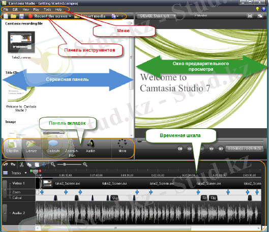 Camtasia Studio 7 бағдарламасының негізгі терезесі бірнеше аймақтарға бөлінеді.
