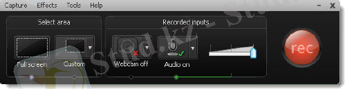 Экрандағы іс-әрекетті жазу процесіне өті үшін бағдарламаның басты терезесінде орналасқан Record the screen батырмасын басу қажет. Сол кезде басты бағдарламаның терезесі төменге оралып түседі де, Жазу панелі пайда болады.