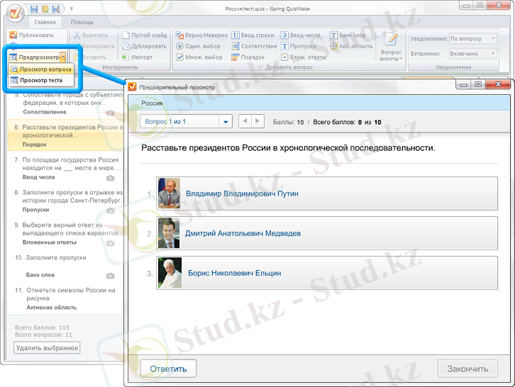 iSpring QuizMaker бағдарламасы қолданушы көзімен барлық тестті немесе жеке сұрақты алдын ала қарауға және онда қателіктер болса оны бірден түзетуге мүмкіндік береді. Алдын ала қарау әсіресе жобаны қашықтан оқыту жүйесіне тікелей жариялаған кезде өте ыңғайлы.