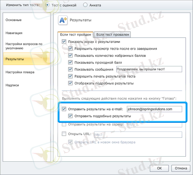 iSpring QuizMaker бағдарламасы тестті өту уақытын орнатуға, мүмкіндіктер санын, өткізу балын баптауға мүмкіндік береді. Құрастырушының талаптарына байланысты өту балы процент күйінде немесе абсолютті формада көрсетілуі мүмкін.