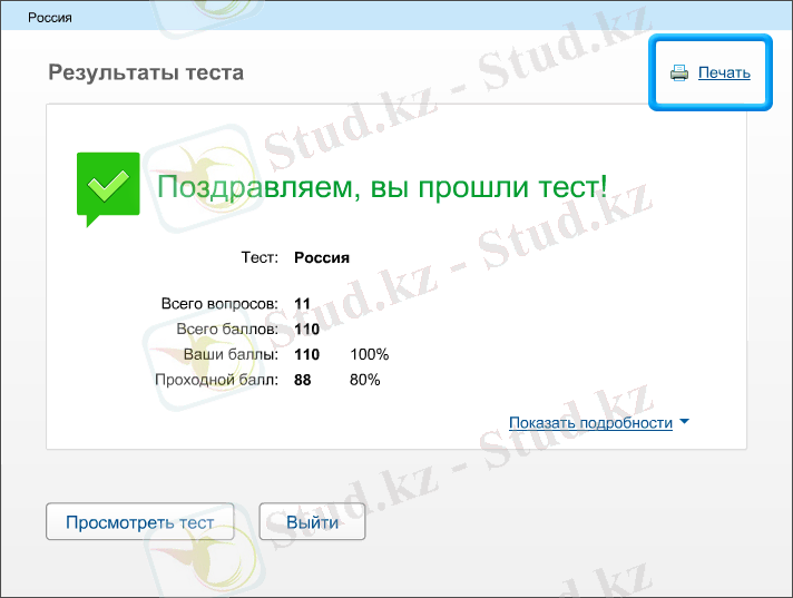 Тест нәтижесі оқытушының серверіне немесе email-на жөнелтілуі мүмкін және студент тестті аяқтаған соң нәтижені қағаз бетіне шығара алады.