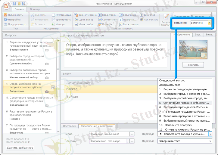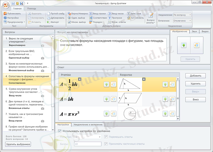 iSpring QuizMaker бағдарламасы әртүрлі тест тапсырмаларын құрастырып, тапсырмалар тобынан кездейсоқ сұрақтар санын таңдалуына жақсы мүмкіндік береді.