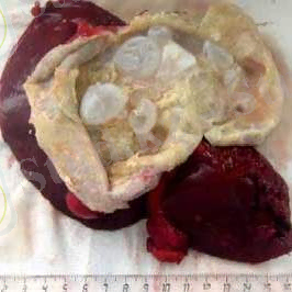 Зақымданған бауыр бірнеше есе ұлғаяды. УДЗ, рентген арқылы анықталады. Тек ота жасау арқылы емделеді.