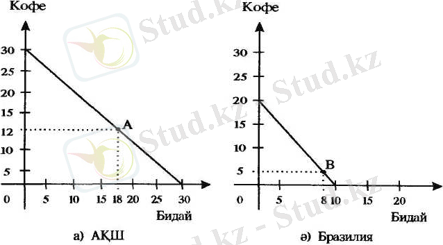 Халықаралық сауда екі мемлекеттен тұрады деп қарастырайық. Мысалы, Бразилия және АҚШ. Екі мемлекет те бидай және кофе өндіреді, бірақ әртүрлі экономикалық тиімділікпен. АҚШ пен Бразилияның өндіріс мүмкіншілігінің қисығы 88-суретте көрсетілген.