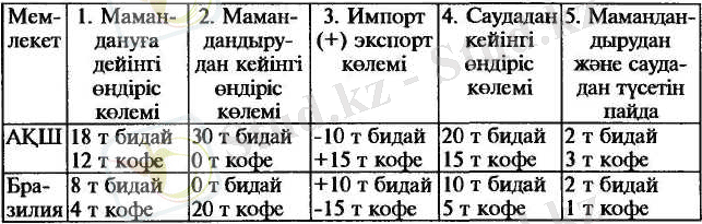 Кестенің 2-бағанасында салыстырмалы артықшылықтар принципі бойынша мамандану нәтижесінде бүкіл әлем шектеулі ресурс арқасында көп өнім шығара алатындығы көрсетілген. АҚШ бидай өндіруге толық маманданғанда 30 тонна өндіріп, кофені мүлде шығармайды. Ал Бразилия кофе өндіруге мамаңданғанда 20 т кофе өндіріп, бидай өңдірісін тоқтатады. Осыдан бүкіл халықаралық экспорт ұтады. Бидай 26 т орнына 30 т, ал кофе 16 т орнына