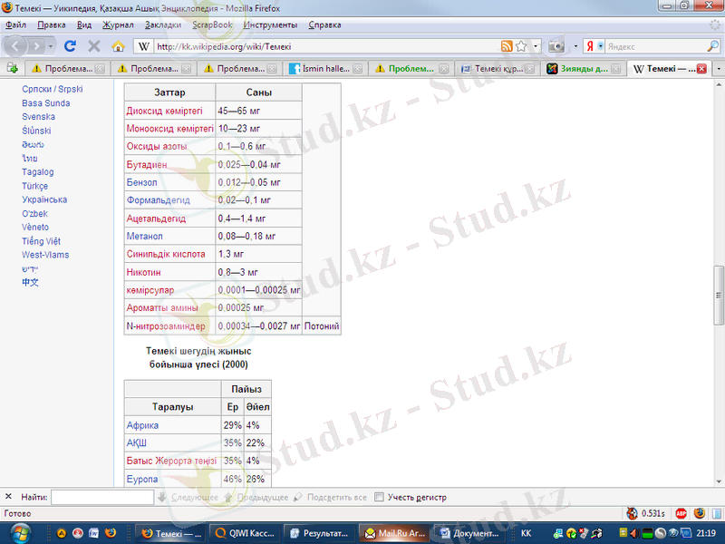 Темекі түтінінің құрамында 12 000 жуық заттар мен химиялық қосылыстар бар. Оның 196 - улы және 14 наркотик тәріздес.