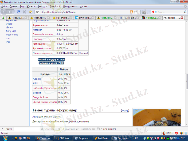 Жыл сайын дүние жүзінде темекі шегудің салдарынан 4 млн. адам қайтыс болады екен. Мұны жыл бойына әр күн сайын 25 авиалайнер апатқа ұшырап, сол себепті түгел ажал құшқан пассажирлердің санымен салыстыруға болады. Бүгінде жер шарында 1, 2 млрд. адам темекі шегетін көрінеді. Дүниежүзілік денсаулық сақтау ұйымының дерегі бойынша, 1997 жылы темекіден 3 млн. адам қайтыс болған болса, бұл көрсеткіш жыл сайын 33 пайызға өсіп отырған. Бұл - бұл ма? Дүниежүзілік денсаулық сақтау ұйымының есебіне жүгінетін болсақ, егер жағдай өзгермесе, онда таяу жылдарда жарты миллиард тірі адамның түбіне темекі жетуі мүмкін көрінеді. Бұл қолайсыз мәлімдеме үрейлендіріп, үркіту үшін емес, нақты факт негізінде жасалып отыр. Ал, Қазақстанға келер болсақ, қазіргі уақытта 5 миллионға жуық адам темекі шегеді екен. Оның басым бөлігі орта жастағы адамдар болса керек.