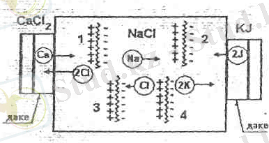 , ал сол электрод пен адам денесінің арасына KJ ерітіңділеріне малынған дымқыл дәке орналастырайық /1-сурет/. Суретте иондардың қозғалысы бағдармен және ұлпалардың шекарасында иондардың жинакталуы 1-4 позицияда көрсетілген. Теріс электродта калий иондары бейтараптанады да, содан кейін сумен екінші реакцияға түсуі нәтижесінде Н