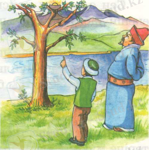 - Мәртебелі патшамыз, бір талды кестіріп, оны ортасынан қақ бөліп, бірдей етіп аршытып, оны балаға көрсетіңіз. Сол кезде бала оның қайсысы жоғары жағынан, қайсысы төменгі жағынан кесілгенін табатын болсын. Таппаса, жазасын алатын болсын.