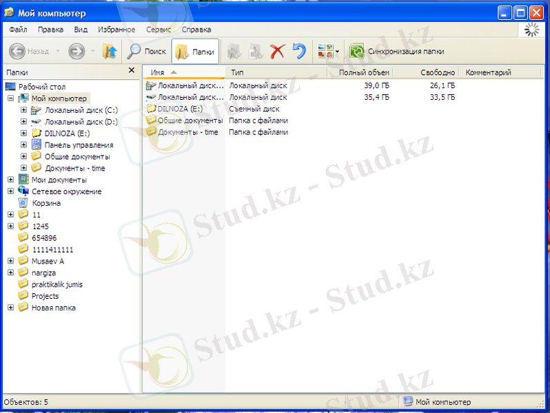 терзесінде компьютерде бар дискілердің таңбашалары орналасқан. Кез келген дискінің таңбашасын белсенді ету (шерту) терезесінің