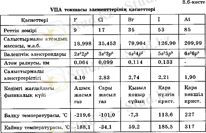Галоген атомдары енжар газдар сияқты тұрақты электрон-дық конфигурация құруға жетпей тұрған бір электронды қосып алуга бейім келеді. Демек, галогендер - күшті тотықтыргыш-тар. Галоген молекуласының атомдарга оңай ыдырауының се-бебі - олардың белсенділігі жоғары болғандықтан, топта фтор-дан йодқа қарай электртерістік төмендейді және бейметалдық қасиеттері әлсірейді.