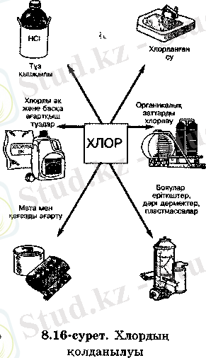 Ол маталарды ағартуда, арартқыш әк, тұз қышкъілын алуда, сондай-ак ауыл шаруашылыры зиянкестеріне карсы күресте пайдаланатын заттарды алуда, ауыз суын тазалауда крлданылады (8. 16-сурет) . Кө-міртек (IV) хлориді, дихлорэтан СН2С1-СН2С1 сиякты органикалык косылыстардың хлор туындылары көп қолданылады. Олардың кей-біреулерін пластикальщ масса (полихлорвинил), синтетикалық тал-шьщ, синтездік көксагыз (каучук), жасанды тері және т. б. алуда пайдаланады. Хлорды улаңдырғыш заттар алуда да колданады: фосген СОС12; иприт (C2H4C1) 2S; хлорпикрин CC13NO2 және т. б.