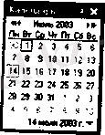Терезеге ағымдық айдың күнтізбесі шығарылады. Оның атауы және жыл жоғарғы қатарға шығарылады. Төменде апта күндерінің қатары орналасқан. Қызыл шектеулермен ағымдық дата ерекшеледі. Тышқан ұсқаушысымен басқа датаны таңдағанда ол сұр түсті рамкамен ерекшеленеді. Ал таңдалған дата терезенің төмен қатарына апарылады. Алдыңғы айға өту үшін