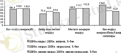 2009 жылғы қаңтар-наурызда кен өндіру өнеркәсібінде 11619, 1 млн. теңгенің өнімі өндірілді, бұл 2008 жылдың сәйкес кезеңіндегі деңгейден 10, 4%-ға көп. Мыс-мырыш кені - 26, 1%-ға, құрамында алтыны бар қойыртпаны - 59, 0%-ға, мыс қойыртпасын - 22, 2%-ға, мырыш қойыртпасын - 10, 1%-ға өндіру артты.