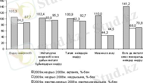 2009 жылғы қаңтар-наурызда машина жасауда 8621, 9 млн. теңгенің өнімі өндірілді, бұл 2008 жылдың қаңтар-наурызындағы деңгейден 55, 5%-ға аз. Өнеркәсіп өнімінің нақты көлем индексі “машиналар мен жабдықтар өндіруде“ - 58, 6%-ды, “көлік құралдары мен жабдық өндіруде“ - 55, 9%-ды, “электр жабдықтарын, электронды және оптикалық жабдық өндірісінде“ - 46, 2%-ды құрады.