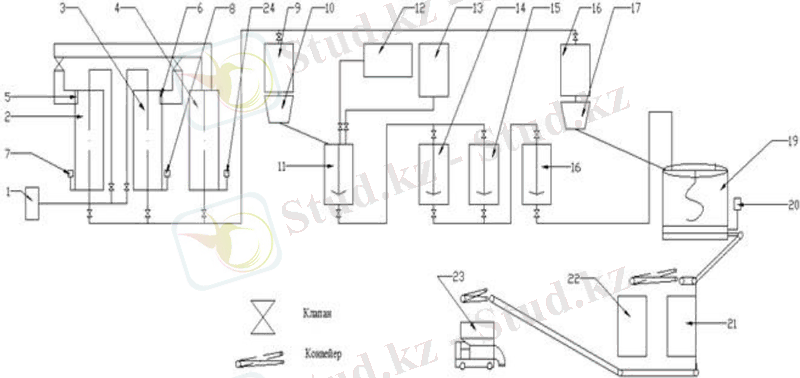 1 - иілгіш құбыршек; 2, 3, 4 - силос; 5, 6 - шаң тазартқыш фильтр; 7, 8, 24 - электронды таразылар; 9, 16 - ұн мөлшерлеуіші; 10, 17 - елеу; 11, 14, 15, 16 - күбі; 12 - су резервуары; 19 - қамыр илеу машинасы; 20 - басқару құралы; 21, 22 - дайын қамыр салатын бункер; 23 - қамырды төсеп - бөлу машинасы.