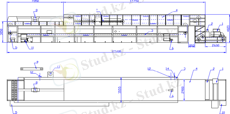 1 - қамырды төсеп - бөлу машинасы; 2 - жағынды жағуға арналған құрылғы; 3- пеш; 4 - қамыр көтеру шкафы; 5 - Шығу транспортері; 6 - жанарғы; 7 - қамыр көтеру уақытын қондыратын құрылғы; 8 - аспирация желдеткіші; 9 - Басқару қалқаншасы; 10 - Жетек; 11 - Желдеткіш; 12 - аспирация шығысы; 13 - Түтін тартқыш Ø400; 14 - Бу кірісі