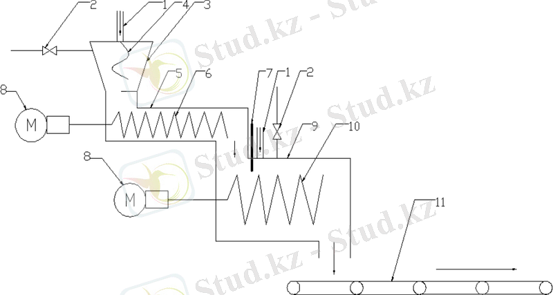 1 - ұн себілетін түтікше; 2 - ашытқы қамыр құйылатын клапан; 3 - құйылмалы қабылдағыш; 4 - араластыру қалағы; 5 - қоспалауыш; 6 - араластыру қалағы; 7 - ылғал өлшегіш; 8 - мотор-редуктор; 9 - пластификатор; 10 - араластыру қалағы; 11 - конвейер.
