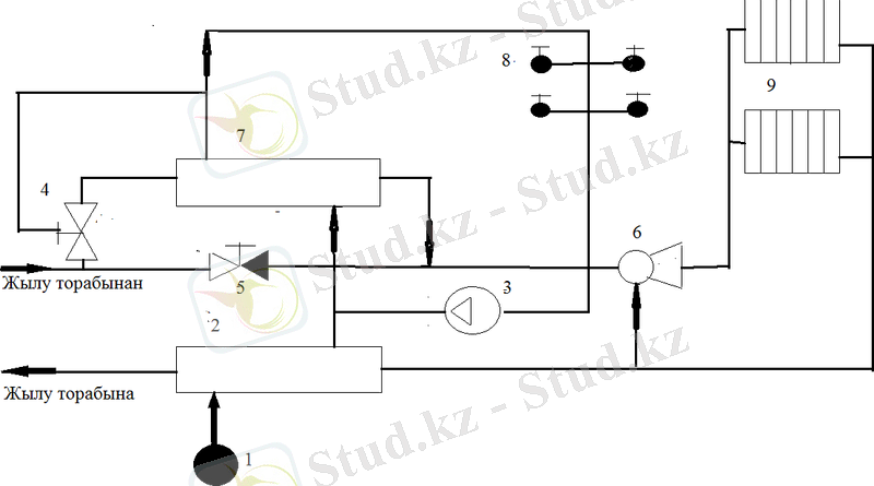 4 - температура реттегіш; 5 - шығыс реттегіш; 6 - элеватор; 7 - жоғары саты су-сулық қыздырғыш; 8 - ыстық су алу шүмегі; 9 - ғимарат жылыту аспаптары.
