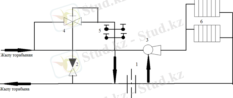 1 - диафрагма; 2 - кері клапан; 3 - элеватор; 4 - араластырғыш - температура реттегіш; 5 - ыстық су алу шүмектері (кран) ; 6 - жылыту аспаптары;