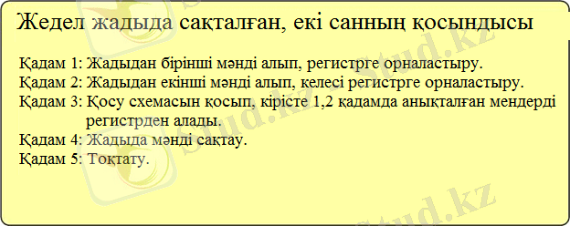 Компьютердің осындай құрылымына сәйкес, жедел жадыда сақталған екі санның қосу операциясы, қарапайым қосу операциясынан мүлдем басқа.