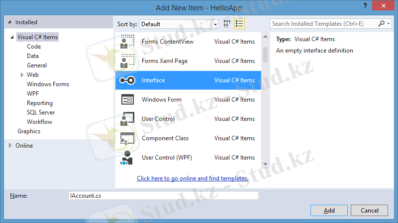 Келесі Iaccount интерфейсін анықтайық. Ол әдіс пен ерекшелікті клиентті санау үшін қолданады. Интерфейсті қосу үшін проект үстіне тышқанның оң батырмасын басып менюде Add-> New Item таңдап, Interface компонентін таңдау керек.