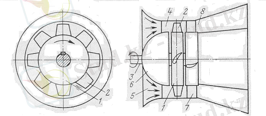 Осьтік желдеткіш (сурет 5. 1) қалақшалары 2 бар төлке түріндегі жұмыс дөңгелегінен 1, біліктен 3, коллекторлы 5 корпустан 4, алдыңғы ағымпаздан (коктан) 6, түзетүші аппараттан 7, шеңбер диффузордан 8 және мойынтіректерден тұрады.