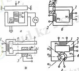 а -қозғалмалы білікпен; б -қозғалмалы катушкамен (1жәнеи 2 - трансформатор орамдары) ; в - длүлкен сызықты орын ауыстыруларды өлшеу үшін (1 -қоздыру орамы; 2 - магнит өткізгіш; 3 - қозғалмалы орам) ; г -үлкен бұрыштық орын ауыстырулар үшін (1, 3, 4 - орамдар; 2 - магниттік тізбек)