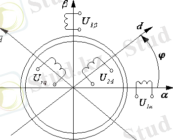 Суретте: α, β - машина статорымен қатаң байланысқан, ортогоналдық координат жүйесі. d, q - машинаның роторымен қатаң байланысқан, ортогоналдық координат жүйесі.