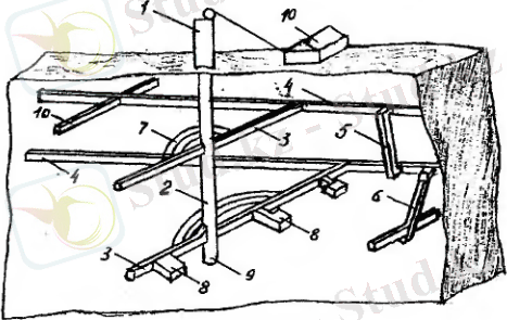 1 -копер; 2 - оқпан; 3 - квершлаг; 4 - штрек; 5 - өрмеле; 6 - гезеник немес тұйық оқпан; 7 - оқпан албары; 8 - камера; 9 - зумпф; 10 - кесінді (рассечка) .