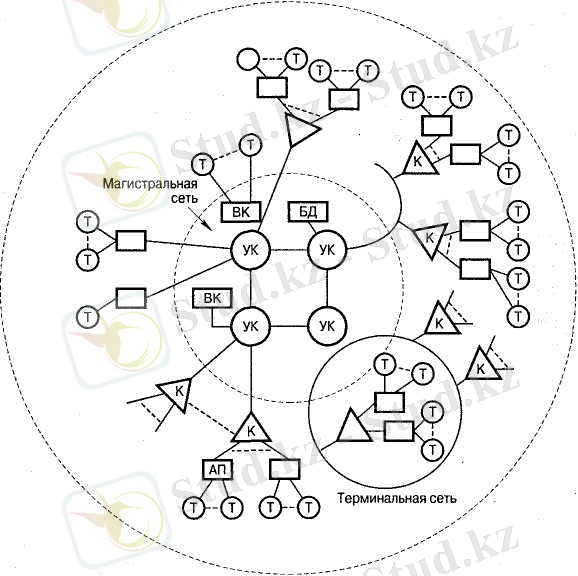 ИҚЦТ құрылымы. ИҚЦТ құрылымы қолданушылардың орналасуымен, ақпараттық-есептеу және байланыс ресурстарын үлестірумен анықталады. ИҚЦТ құрылымы магистралдық (базалық) және абоненттік (терминалдық) (1 сурет) болып бөлінеді.
