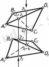 1. 1-суретте төртжақтың проекциялары берілген. 1 және 2 нүктелері - фронталь-бәсекелес, ал 3 және 4 нүктелері - горизонталь-бәсекелес. Бәсекелес нүктелердің өзара орналасуына қарап фронталь проекцияда АD қыры көрінетінін, ал ВС қырының көрінбейтінін анықтаймыз.