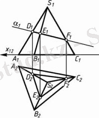 F нүктесін осындай әдіспен тұрғызады, себебі SB қыры арқылы жүргізілген қосымша қиюшы проекциялаушы жазықтық проекцияның профиль жазықтығына параллель болады да, ешқандай шешімге алып келмейді. 4 нүктесі SAB жазықтығының горизонталь ізі мен α қиюшы жазықтығының қиылысу нүктесі болып табылады: (А2В2) ∩h2=42. Е және 4 нүктелері SAB жазықтығы мен α қиюшы жазықтығының қиылысу сызығына тиісті. Е242 түзуінің S2В2 түзуімен қиылысу нүктесін табады: (Е242) ∩(S2В2) =F2. Байланыс сызығы бойымен F нүктесінің фронталь проекциясын табады. DEF үшбұрышы ізделінді қима болып табылады.