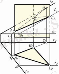 Призманың бүйір жақтары - горизонталь проекциялаушы жазықтықтар болғандықтан қиманың горизонталь проекциясы A2B2C2 белгілі - ол бүйір жақтарының және қырларының проекцияларымен сәйкес болады. Қиманың фронталь проекциясын тұрғызу үшін қиюшы жазықтыққа тиісті А, В, С нүктелерінің фронталь проекцияларын анықтау қажет. А2 және В2 нүктелері арқылы (1, 2) түзуінің - горизонталь (1222) проекциясын жүргізеді. (1, 2) түзуінің фронталь (1121) проекциясында А1, В1 фронталь проекцияларын табамыз. С нүктесінің фронталь проекциясын табу үшін алдымен C2 арқылы f´ фронталінің f´2 горизонталь проекциясын жүргізеді. Ол α жазықтығының h горизонталінің h2 горизонталь проекциясымен қиылысады: f´2∩h=32. f´ фронталінің f´1 фронталь проекциясы 31 нүктесі арқылы f фронталінің f1 фронталь проекциясына жүргізеді. f´1 түзуі призманың сәйкес қырымен қиылысқанда С нүктесінің ізделініп отырған С1 проекциясын табылады.