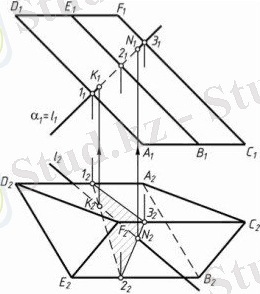 1. 5-суретте үшбұрышты көлбеу призманың l түзуімен қиылысу нүктелері табылған. Алдымен l түзуі арқылы фронталь-проекциялаушы α(α1) жүргізілген. Призма мен α жазықтығының қиылысу сызығы тұрғызылған. Ол үшін призма қырларының α жазықтығымен қиылысу нүктелері табылған: 1=l∩(AD), 2=l∩(BE), 3=l∩(CF) . Қиылысу сызығының фронталь проекциясы l түзуінің l1 фронталь проекциясымен беттеседі. Қиылысу сызығының горизонталь проекциясы l түзуінің l2 горизонталь проекциясымен K2 және N2 нүктелерінде қиылысады. Байланыс сызықтары арқылы ізделінді нүктелердің K1 және N1 фронталь проекциялары табылған.
