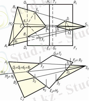 SC қырының α(f∩h) жазықтықпен D қиылысу нүктесі - фронталь проекциялаушы β(β1) жазықтығының көмегімен табылады. Осындай тәсілмен, қиманың Е нүктесін де табуға болады. Алайда, басқа тәсілді де қолданса болады. Қиюшы α жазықтығының h горизонталі пирамида табанының жазықтығында орналасқан. Сондықтан пирамиданың SАС жағының ізі болып табылатын АС қыры қиюшы жазықтықтың горизонталь ізімен қиылысады. А2С2 түзуінің h2 түзуімен қиылысу нүктесін табады: (А2С2) ∩h2=32. D және 3 нүктелері SАС жазықтығы мен α қиюшы жазықтығының қиылысу сызығына тиісті. D232 түзуінің S2A2 түзуімен қиылысу нүктесін табады: (D232) ∩(S2 A2) =E2. Байланыс сызығы бойымен Е нүктесінің фронталь проекциясын табады.