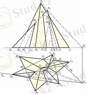 1. 7 - суретте табандары бір жазықтықта жататын SABC және PDEF пирамидаларының қиылысу сызығын табу көрсетілген. Пирамидалардың бүйір қырлары мен жақтарының қиылысу нүктелерін анықтау үшін олардың төбелері арқылы SP түзуі жүргізіліп, оның горизонталь ізі K нүктесі табылған. SP түзуі арқылы өтетін көмекші жазықтықтар көпжақтардың жақтарын түзулер бойымен қияды және ол жазықтықтардың горизонталь іздері K нүктесі арқылы өтеді. K2 нүктесі АВС және DEF үшбұрыштарының орналасуына байланысты пирамидалардың қиылысатынын немесе қиылыспайтынын, қиылысса қай қырларының екінші көпжақпен қиылысатынын анықтауға болады. Пирамидалардың табандары L, M, V, R, T, G нүктелерінде қиылысады. Ал қырлардың ішінде РD және РЕ қырлары ғана SABC пирамидасын қияды.