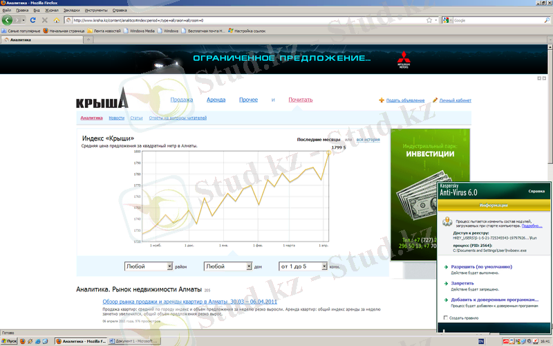 Бұл диаграмма 2011жылдағы ай сайынғы бағаның өзгерісі көрсетілген. Яғни қаңтар айында 1758$, ақпан айында 1753$, наурыз айында 1772$, ал сәуір айында 1799$-ды құрап отыр. Бұл осы жылы мерзімнің өтуіне байланысты 1м2 бағасы өсіп жатыр.