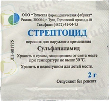 Стрептоцид-Streptocidum . . Иіссіз, дәмсіз, ақ түсті, майда кристалды ұнтақ. Суда нашар ериді 1:170, спиртте 1:35 40 пайызы ерітіндісінде, глюкоза ерітіндісінде жақсы ериді, ал қышқылдар 1:7 мен негіздер 1:10 ерітіндісінде жақсы ериді.