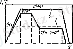 Қалың қабырғалы құймалар жылдам салқындамайды, сондықтан кристалдану кезінде өзегінде пластинкалы графит пайда болады. Мұндай шойын соғылғыш шойын алу үшін жарамайды, себебі жасыту процесінде түзілетін графит құрамындағы графит пластинкаларына қосылады. Ферритті соғылғыш шойынды алу үшін жасытуды, 10. 3 - суретте көрсетілген, 1 режим бойынша жүргізеді. Ақ шойын құймаларын 950 - 1000 °С (эвтектоидтық температурадан жоғары, бірақ эвтектикалық нүктеден төмен) температураға дейін баяу (20 - 25 сағат) қыздырамыз. Одан кейін осы температурада ұзақ уақыт (10 - 15 сағат) ұстаймыз. Ұстау процессі кезінде графиттелудің бірінші кезеңі өтеді - эвтектикалық цементиттің және екінші ретті цементиттің аустенитке пен графитке ыдырауы: Ц → А + Г жас .