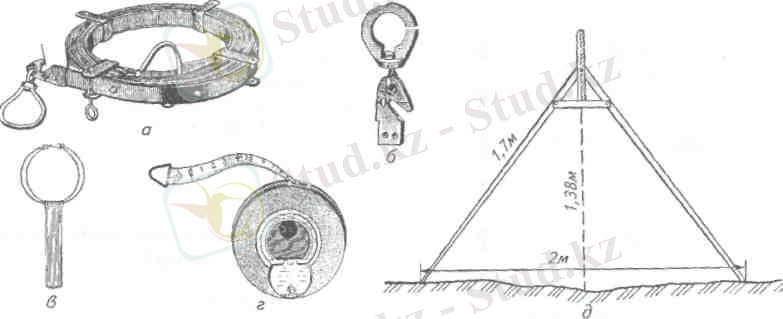 а - өлшемдік лента; б - өлшемдік лентаның шеттері ілгек түріндеқ; в - темір ұштамалары; г - рулетка; д - өлшемдік циркуль - «екі метрлік».