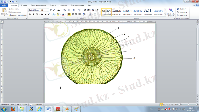Сурет - 5. Су сүмбілесі (гиацинт) тамырының анатомиялық көрінісі: 1- эпиблема (клетканың қалыңдығы) ; 2 - қабықтың сыртқы қатары; 3 - қабықтың аэренхимасы; 4 - қабықтың ішкі қатары, 5 - орталық шеңбер; 6 - өзек