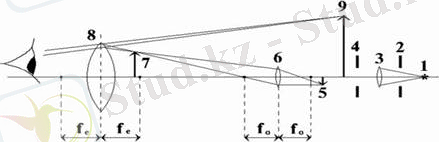 4. 1 - сурет - Оптикалық микроскоптың оптикалық сызбасы: 1 - жарық көзі, 2 - конденсордың апертуралы диафрагмасы, 3 - конденсорлы линза, 4 - өрістік диафрагма, 5 -нысан, 6 - объективті линза, 7 - алғашқы үлгейтілген шынайы бейне, 8 - окулярлы шынайы линза, 9 - екінші үлкейтілген көмескіленген бейне