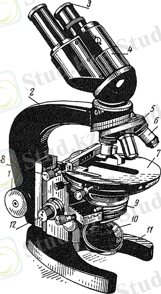 1 - дөрекі фокустайтын бұранда; 2 - ұстайтын мойны; 3 - окуляр; 4 - бинокулярлы тубус; 5 - револьвер; 6 - объектив; 7 - заттық үстел; 8 - препаратты жылжытқыш; конденсор; 10 - айна; 11 - штатив негізі; 12 - нақты фокустайтын бұранда.