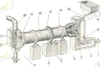 Барабанды айналмалы пештің негізгі элементі - металды барабан 12. Барабанның сыртқы бетінде ені 150-250мм болатын ажырамайтын сақина тәріздес екі тіректі болат құрсау 14 бекітілген. Әрі құрсау, ені 50-100м болатын аунақшаларға 4 тірелген. Бекіту аунақшалары горизонтқа 3-6 0 кіші көлбеулі барабаны орналасқандай темір бетонды іргетасқа 5 бекітілген болат массивті плиталарда орналасқан. Бұл барабан айналғандағы пеш ішіндегі материалдық орын ауыстыруын қамтамасыз етеді. Жетек электрдвигательден бәсеңдеткіш, тістегеріш 6 және тісті тәж 13 арқылы іске қосылады. Қазіргі кептіргіш барабандары 2-8айн/мин шамасындағы айналу жылдамдығын келтіретін үш және төрт жылдамдықты электр қозғалтқышпен қамтамасыз етілген.
