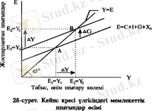 Мемлекеттік шығындардың өзгерісін көру үшін кейнс кресін пайдаланамыз. Мемлекеттік шығындар жиынтық шығындардың құрауышы болып табылады, олардың өсуі жоспарланған шығындарды да өсіреді. Егер мемлекеттік шығындар ∆G -ға өссе, онда жоспарланған шығындар қисығы оңға қарай сол мәнге жылжиды. Ал тепе-теңдік өнім көлемі Ү
