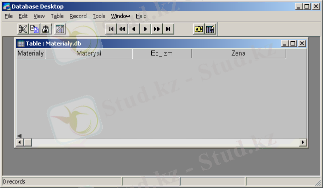 Құрылған кесте реструктурлануы . Егер МБ бар кестелерге өзгерістер енгізу керек болса, FileOpenTable меню элементін таңдау керек, пайда болған диалогты терезеден кесте атын таңдап Ок батырмасын басу керек. Кесте мазмұны көрсетіледі. (11-суретте Materialу кестесінде жазуларды жоқ болады, өйткені біз оған мәліметтерді енгізген жоқпыз ) .