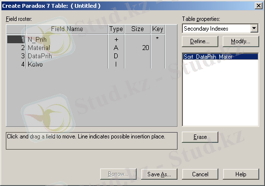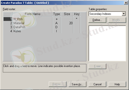 Prihod ( Save кнопкасын ) кестесіндегі өзгерістерді сақтап, Prihod ( Table Restructure ) кестесінің реструкизациясы режіміне қайта кіреміз. Table properties тізімінде Secondary Indexes элементін таңдаймыз индекстер тізімінде Material атмен пайда болған жаңа индексті көреміз . Бұл индекс сілтегіш бүтіндік құрылған кезде автоматты түрде тұрғызылған ( сурет 19) .